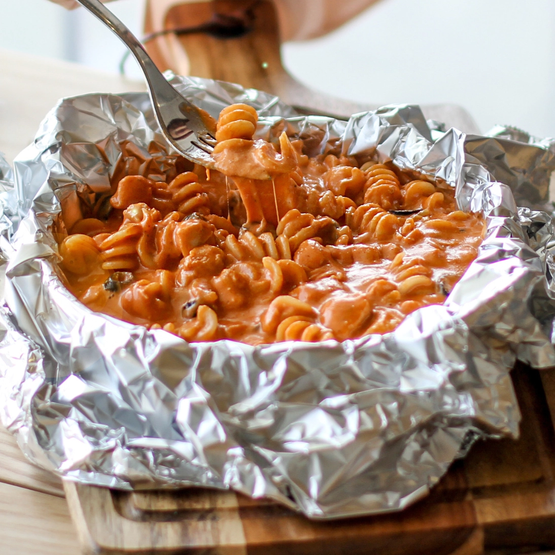 Fusilli pasta with cheese, chicken, mushrooms and olives