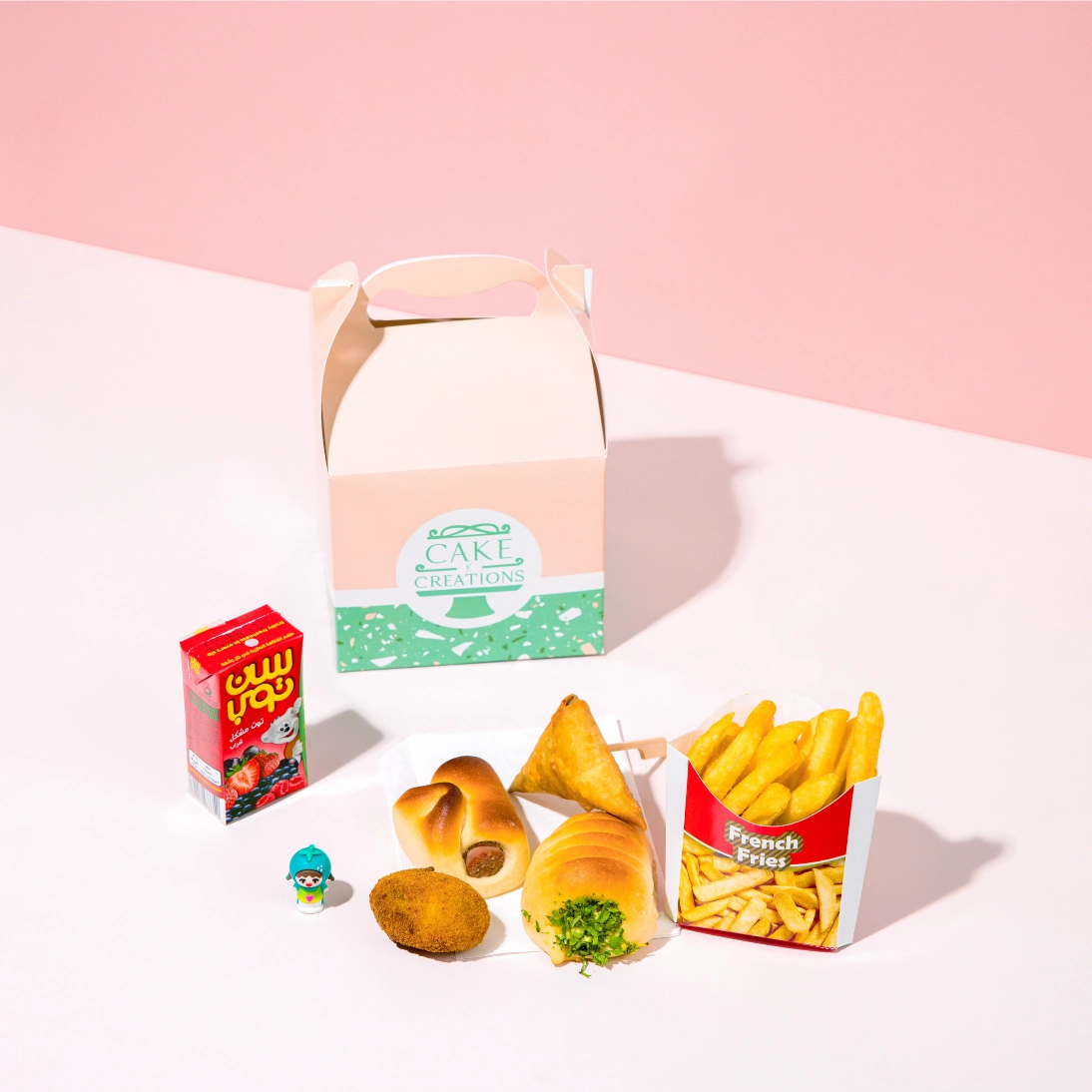 ١ سمبوسة، ١ رول دجاج، ١ كاتلس، ١ رول نقانق، بطاطا مقلية، سن توب، لعبة