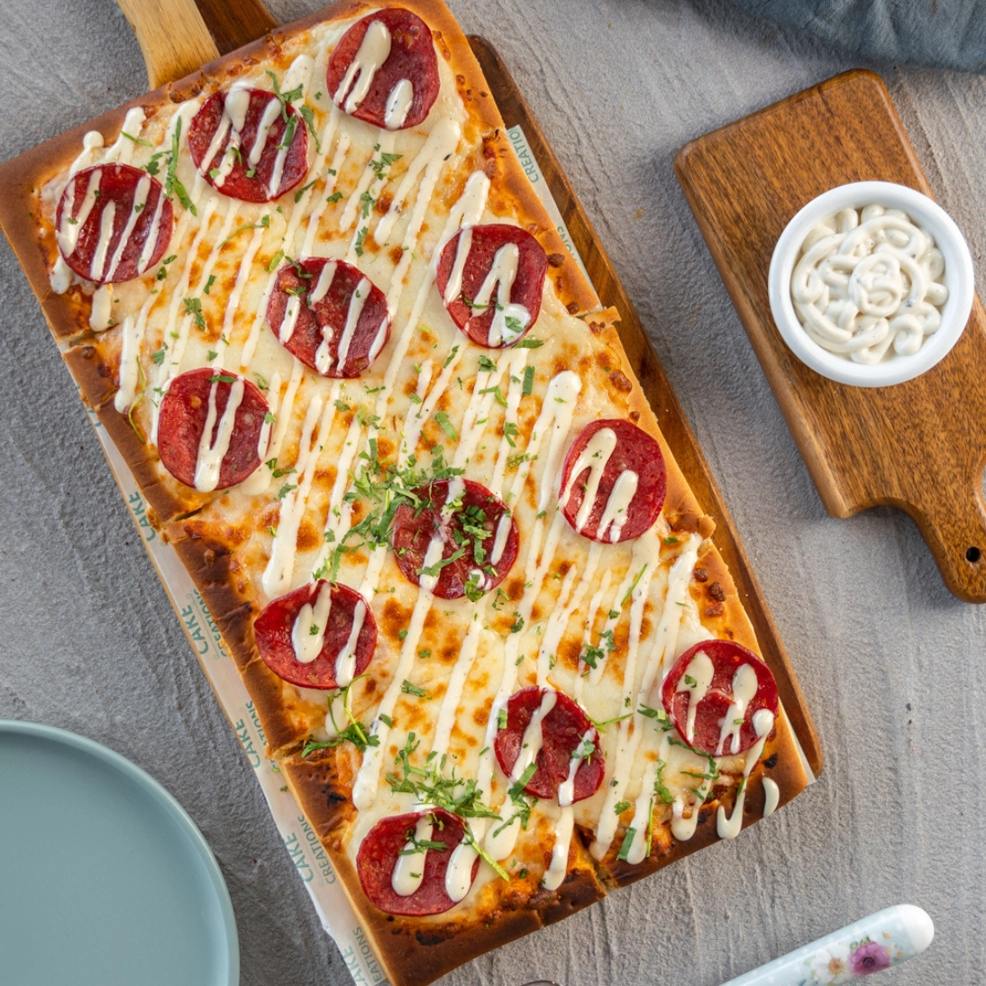 Homemade pizza dough with mozzarella cheese and pepperoni topped with ranch sauce and cilantro.