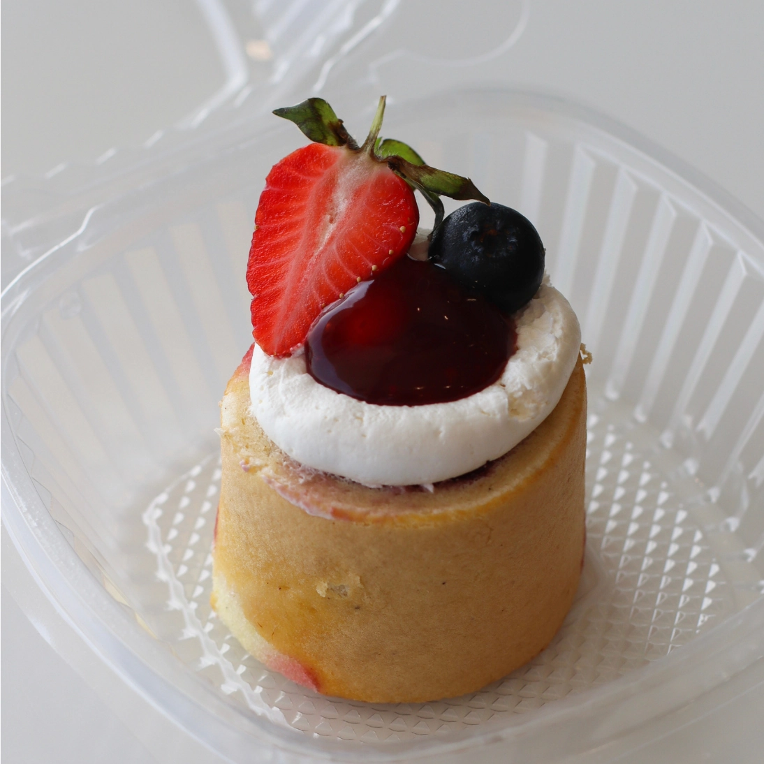 شريحة من كيك السويسرول الملفوف بكريمة ناعمة، ومزين صوص الفراولة.